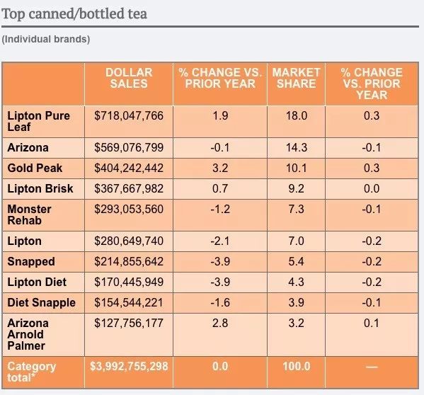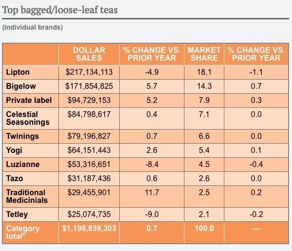 IRI的数据进一步显示,截至2019年4月21日,过去一年即饮罐装和瓶装茶在美国的销售额约为39亿美元,较上年同期增长0.5%,这反映出即饮茶的受欢迎程度。不过,即饮茶在细分领域的表现却截然不同。虽然冷藏茶和袋装/散装茶的销售额都有所增长,分别为16亿美元和12亿美元。但与去年相比,冷藏茶一路高歌猛进,销量增长幅度高达9.6%,而袋装/散装茶的销量则表现平平,仅增长了0.7%。