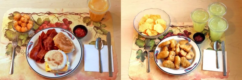 实验中的 “超加工饮食”范例,左图有培根、奶酪松饼、土豆泥、番茄酱、橙汁。右图有炸鸡块、番茄、 烤土豆片、人造甜味剂柠檬水。