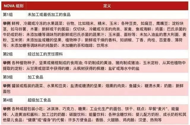 NOVA系统根据食物被加工的程度和目的进行分类。简单点说,“未加工饮食”就是食物最原本的样子。而“超加工食品”(Ultra-processed foods)往往是即食食品或冷冻微波食品:打开就能吃,微波就能吃,制造工序复杂到你自己没法做,成分常常超过五种,配料表上有你从没听说过的化学物质。