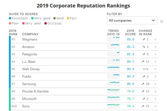 今年3月,The Harris Poll 联合Axios开展民调,超过24000名美国成年人对全美100家最为人熟知的企业进行评价,Wegmans力压亚马逊、微软等,排名第一。