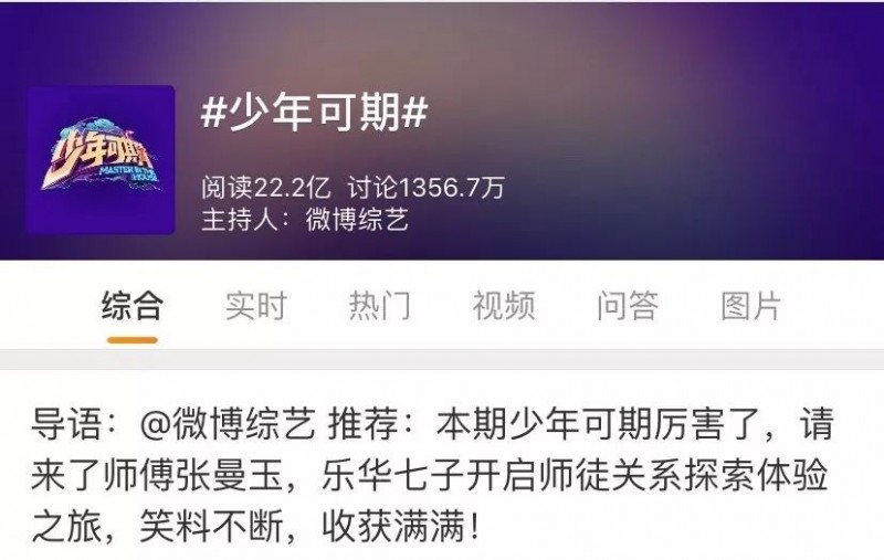 作为中国首档师徒关系探索体验类真人秀节目,《少年可期》的关注度随着影后张曼玉的加入达到顶峰。微博同名话题阅读量达到22.2亿,讨论达1356.7万。