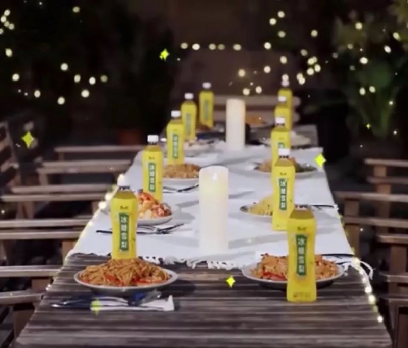 结合生活化场景进行沉浸式置入,也是比较常规的植入方式。但康师傅冰糖雪梨在这之上进行了创新,通过颇具巧思的陈列制造视觉锤,相较刻意堆放模型,更加自然,又足够吸引关注。