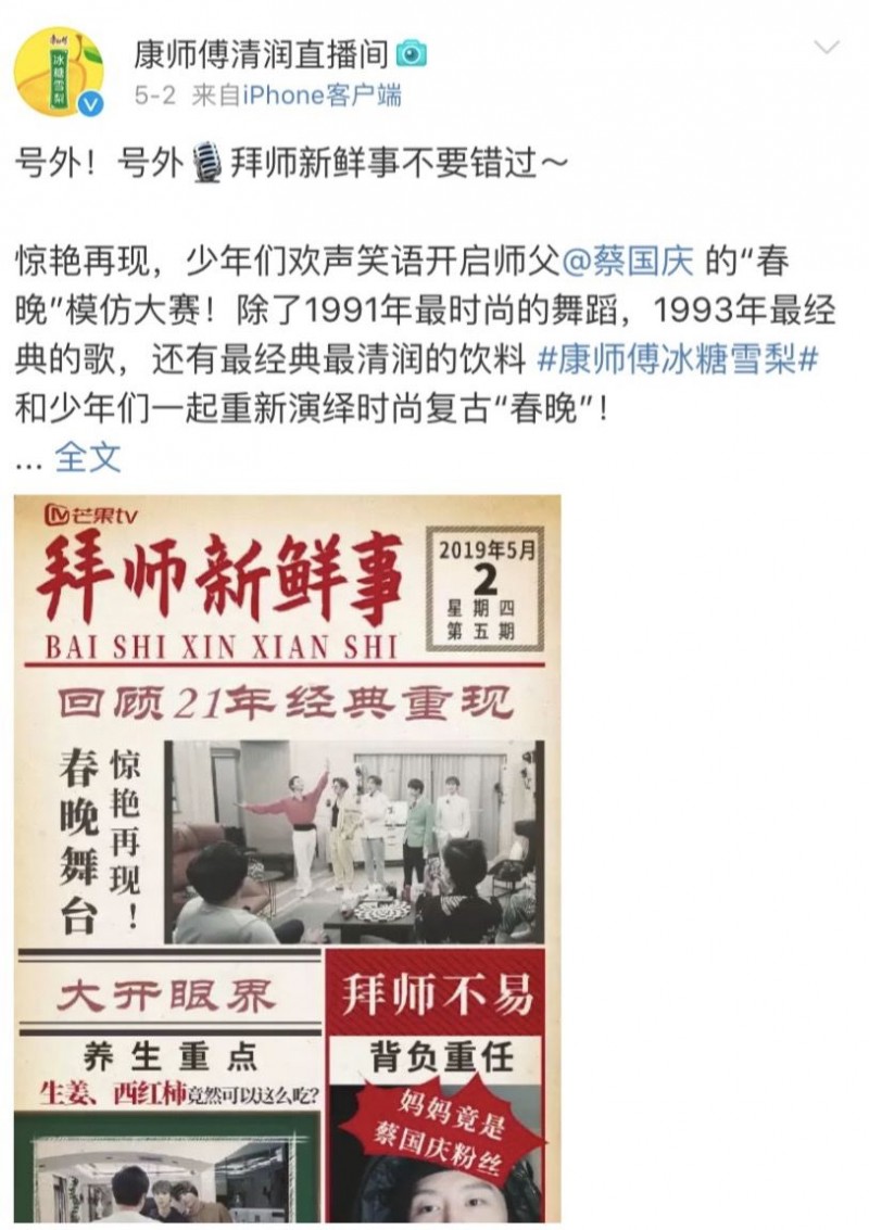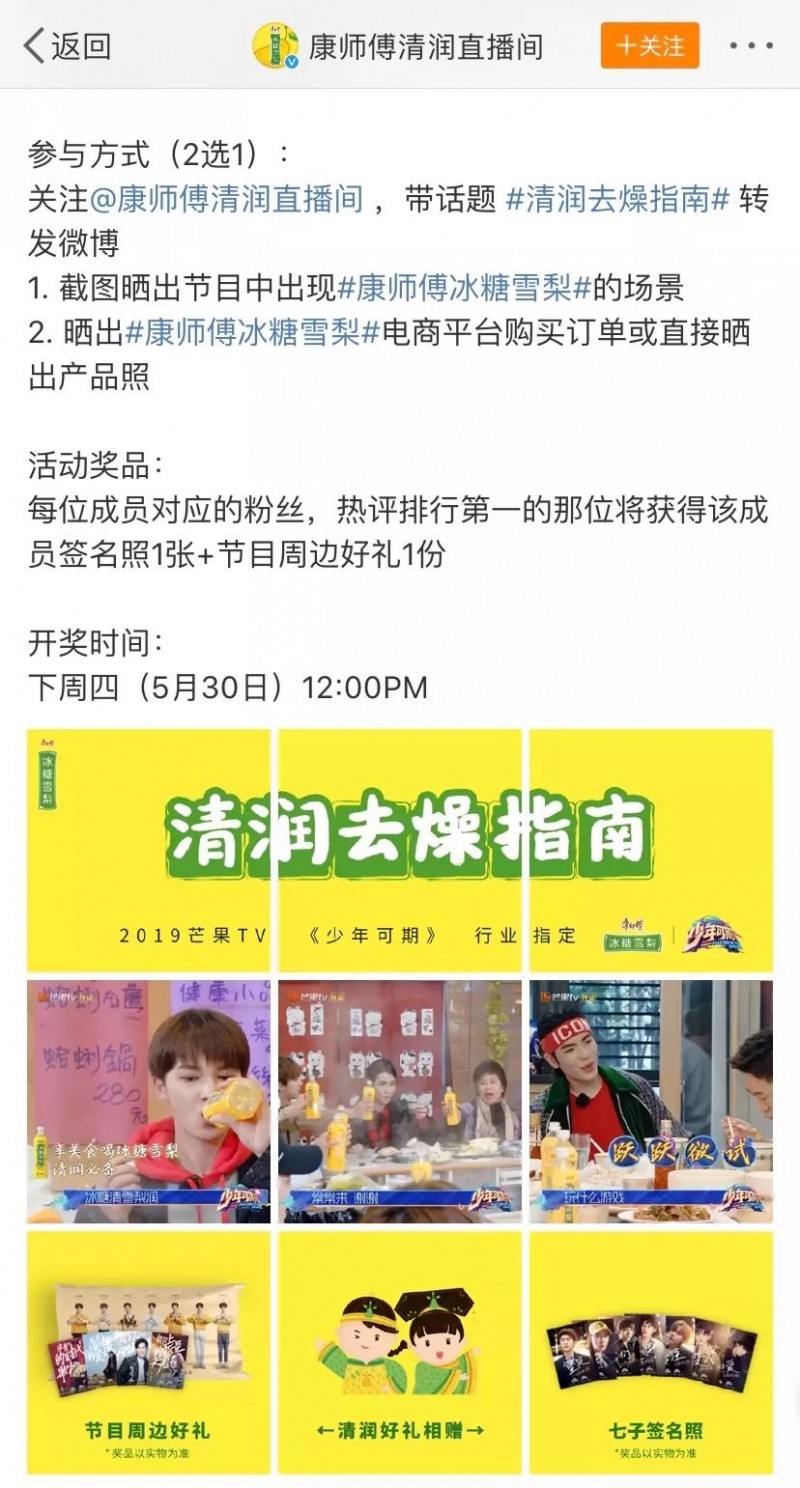 康师傅冰糖雪梨在《少年可期》中的综艺营销,最大的亮点在于,它并没有仅仅停留在“露脸”阶段,而是积极通过微博与大众进行互动。生生将一场综艺植入,玩成了一场品效合一的多元化互动营销。