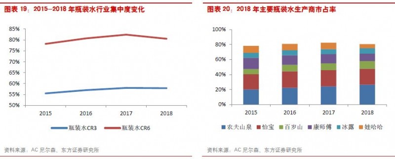 根据AC尼尔森统计数据,18年我国瓶装水行业CR3、CR6分别达到了57.9%、80.5%,农夫山泉、怡宝、百岁山、康师傅、冰露和娃哈哈占据了八成份额。