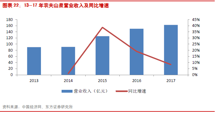 业绩稳健增长,农夫山泉一直在路上。根据中国经济网披露的数据,13-17年间农夫山泉营收从90亿元逐年提升至162.5亿元,CAGR为15.9%,期间15、16年农夫山泉的收入增速分别高达38.6%、19.0%,我们推测与高端新品及爆款单品茶π的推出有关。
