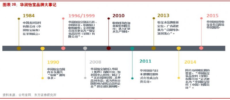 公司是国内包装饮用水领军者之一,进军行业时间较早经验丰富。1984年,中国龙环饮料有限公司(华润怡宝前身)成立,总部位于深圳市高新技术产业园区,主要销售碳酸饮料。