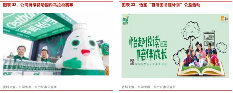 公司积极关注体育事业,持续赞助国内马拉松赛事。以2017年度为例,公司累计赞助马拉松比赛182场,连续两年成为国内马拉松赞助场数第一名的瓶装水企业。此外,公司组建了“怡宝梦之队”,在多场马拉松比赛中取得优异成绩,也为品牌宣传提供了一定助力。在公益活动方面,公司从2007年起启动“百所图书馆计划”,为教育资源匮乏的地区建设图书馆、捐赠图书,同时邀请专家和社会志愿者举办读书会,帮助实现城市与乡村之间的教育资源共享。截至2017年,公司已捐赠了192所图书馆,募集了上万册图书,得到了社会的广泛认可。