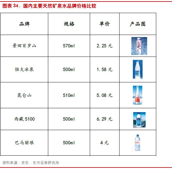 伴随着消费升级趋势和居民健康意识的觉醒,大众对于瓶装水的偏好逐渐从纯净水向更健康的天然矿泉水转变。景田百岁山在饮用水市场中定位中端,但在天然矿泉水品类中定价较低。相较于更高端的矿泉水品牌,景田百岁山具有突出的性价比优势,更易被消费者接受,以价换量尽享升级红利。