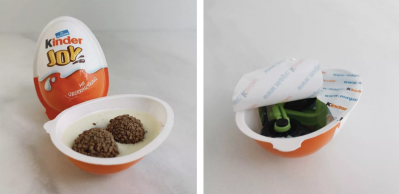 后来,健达就改良了原来的产品设计,把玩具和巧克力对半分装在奇趣蛋的两边,“蛋”的形状仅用塑料包材去维持,也就是我们现在见到的“奇趣蛋”。