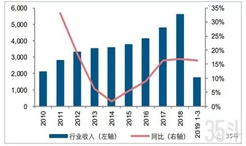 2010-2018年食品饮料行业收入及增速(单位:亿元)