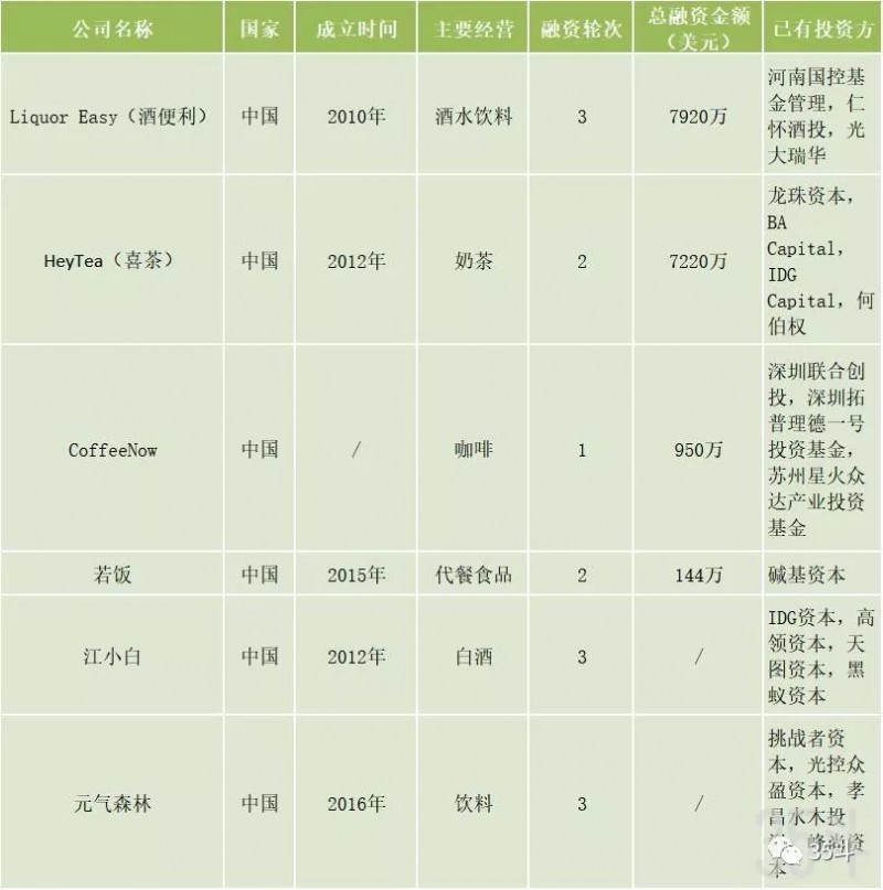 35斗梳理国内外30家食品饮料初创公司后发现:美国近年的食品饮料创新公司发展迅猛,在去年披露的200起交易中,食品饮料达到了14.5亿美元。对比国内,许多食品饮料初创公司也是势头大好,像喜茶这样年轻化的网红品牌,经过两轮融资就拿到超7000万美元的融资,可见越来越多的国内投资者开始关注食品饮料的市场。