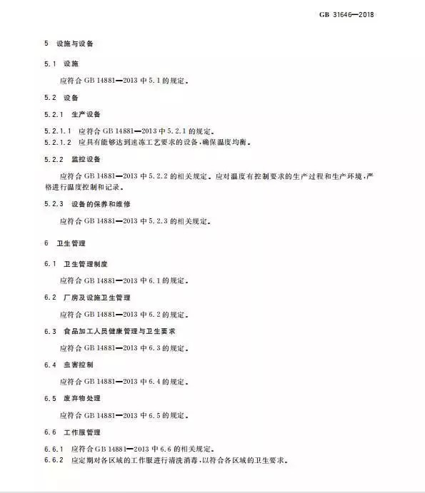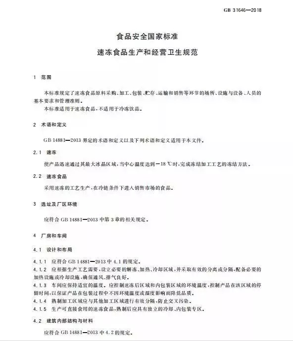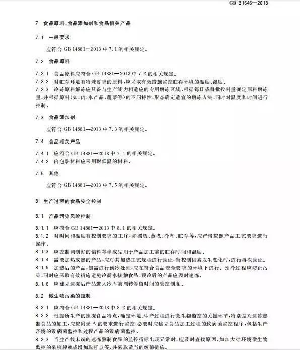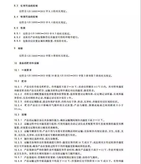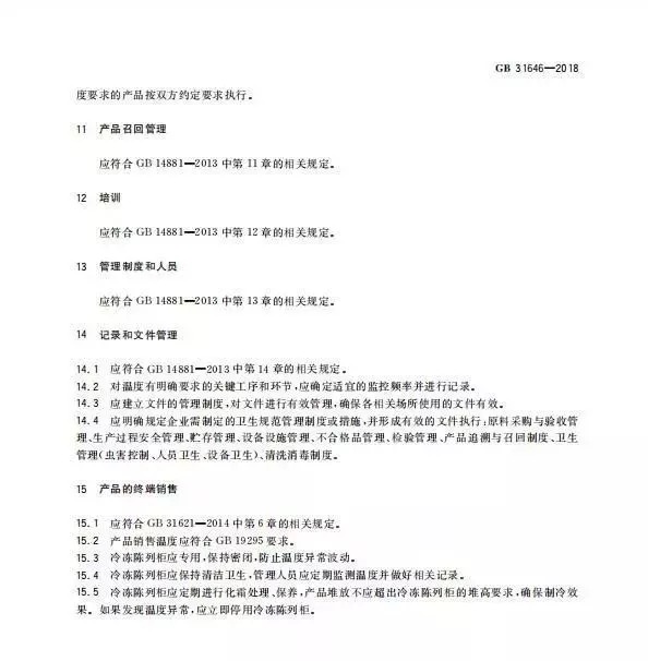 关于速冻食品的产品召回管理、培训、管理制度和人员以及检验等内容的要求,标准中直接引用至GB 14881,大家有需要了解可查看标准原文。