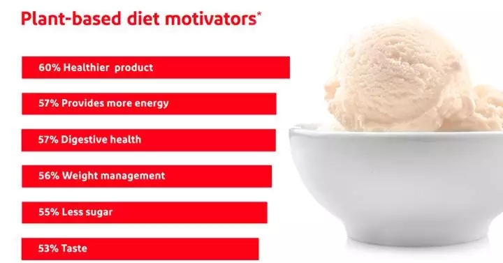 过去十年中最普遍的消费趋势之一是健康与保健。因此,健康被认为是食用更多植物基食物(60%)的头号动力。人们通常认为植物性产品更健康。其它采用植物基食物的动机也被认为与个人健康有关,包括提供了更多能量(57%);促进健康消化(57%);体重管理/减重(56%);以及含有较少的糖(55%)。口味也是其中一个因素;略超过一半的受访者表示他们更喜欢植物性食物的味道。