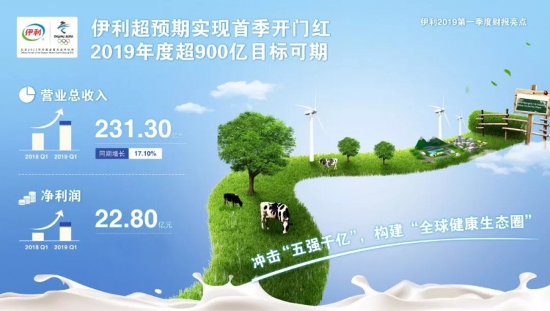 2019 年 4 月,伊利董事长潘刚在人民日报发表了署名文章,提出“全球健康生态圈”的概念。4 月 25 日,伊利股份发布了 2019 年第一季度业绩报告。报告期内,公司营业总收入 231.3 亿元,同比增长 17.1% ;净利润达到 22.8 亿元,进入“五强千亿”倒计时。潘刚表示,高增长的业绩得益于伊利健康生态圈的构建。伊利通过汇聚全球的各方优质资源,成为横跨大健康领域内多品类的布局者、带动健康食品行业发展的引领者、值得消费者信赖的健康食品提供者,实现健康领域的新生态、新价值。