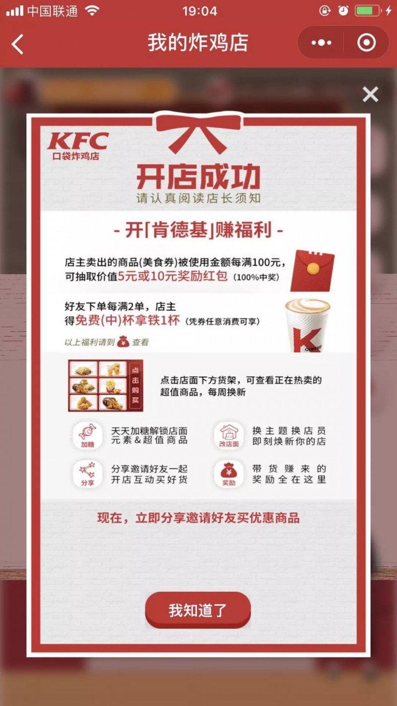 每一位消费者都可以通过小程序自由开店,成为一名肯德基“虚拟店长”。每一位店长只需要将店内的肯德基特价餐品售卖出去,便可有条件获得相应的奖励,包括产品优惠、代言人周边等。