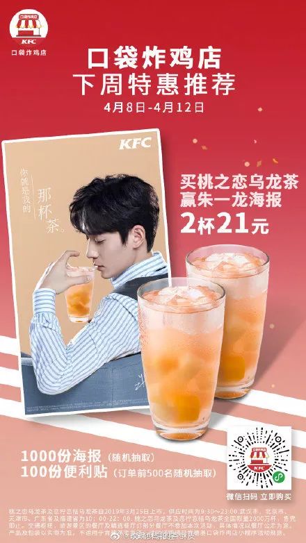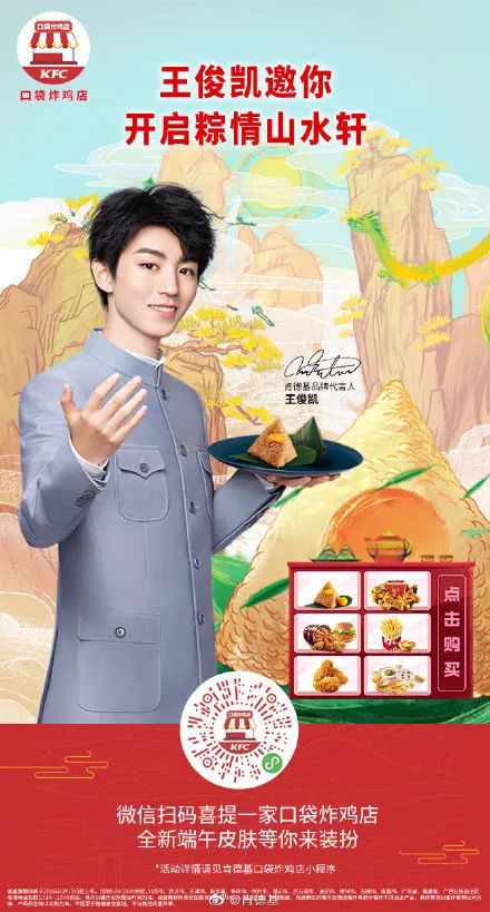 口袋炸鸡店的门店主题设计永远是与品牌外部营销资源绑定在一起。现在打开口袋炸鸡店小程序,用户能够选择鹿晗代言新品“绝代双椒主题店”、王源代言“毕业欢享桶主题店”、“朱一龙咖啡店”等场景开店。这些场景都是目前品牌正在推动的新品战役和娱乐营销战役。