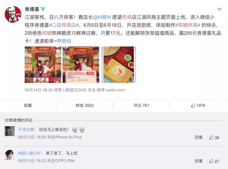 2018年圣诞节前夕,肯德基上线了口袋炸鸡店限时快闪活动,让粉丝参与到鹿店长运营炸鸡店的故事中去。这是口袋炸鸡店首次出现在消费者的视野当中,而自发的流量将炸鸡店话题推上热搜,让品牌看到了口袋炸鸡店的运营潜力。