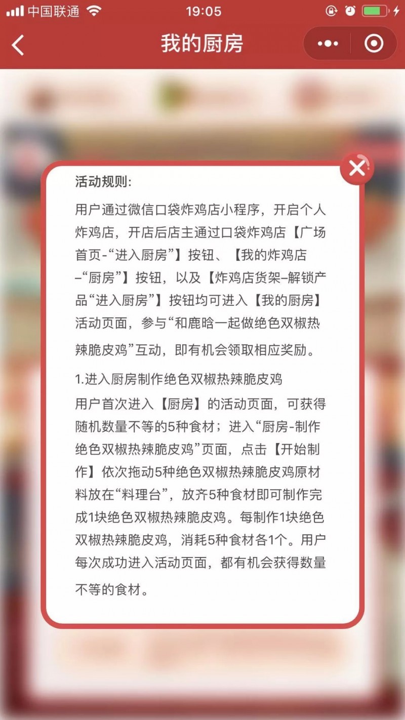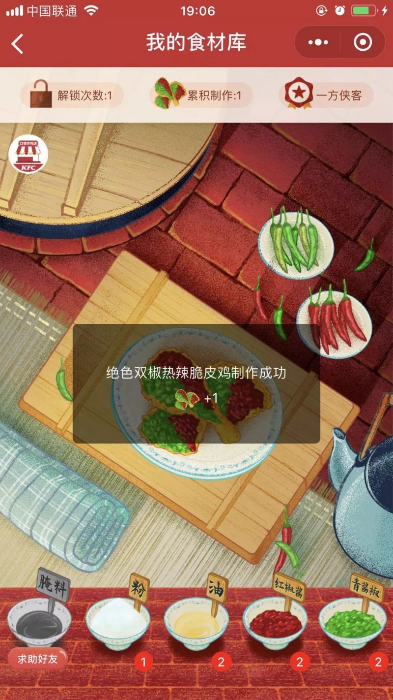 从只有一个店面,到现在还开发出了后厨的功能,通过完善游戏互动机制去增加口袋炸鸡店的互动属性。比如现在正在进行的双椒炸鸡新品战役中,用户想要卖双椒炸鸡首先要在自己的厨房做炸鸡。想要制成更多的炸鸡去售卖,就需要求助好友获取原材料。