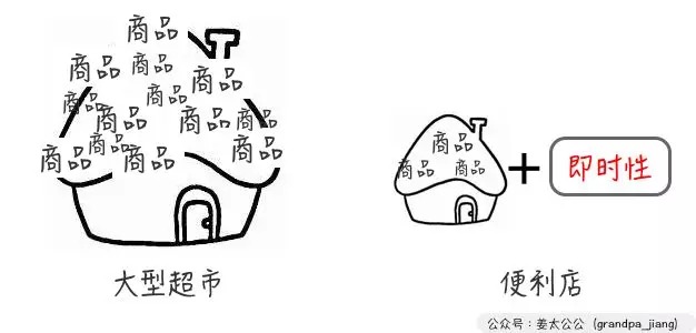 7-Eleven则是给产品增加了“即时性”的原生价值。正因为这种即时性,构成了7-Eleven和大型超市在用户心中的定位是完全不同的。这种业态,让那些在大型超市可以买到的商品,因为“即时性”,而成为独一无二的。