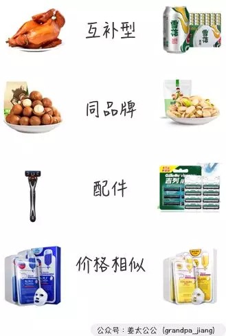 1.互补性产品:两种产品没有竞争性,具有补充性质。可以是使用场景互补,性质互补等等等。比如我购买了一袋薯片,我会顺便购买一个可口可乐,防止噎到。比如超市的熟食区会摆放啤酒,因为看球的时候,爷们儿要有吃有喝。