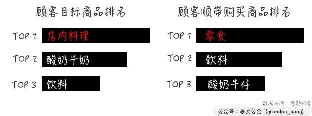 便利店的餐饮品类一定程度上带动了其他品类的销售增长。顾客的目标商品的 Top 3是店内料理,牛奶,饮料。这些商品是用户进入便利店的驱动力。但是,没有完,用户还买了很多他们进店前没有想买的商品,比如零食。