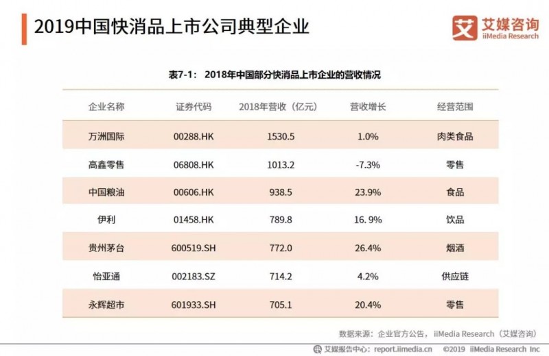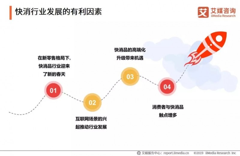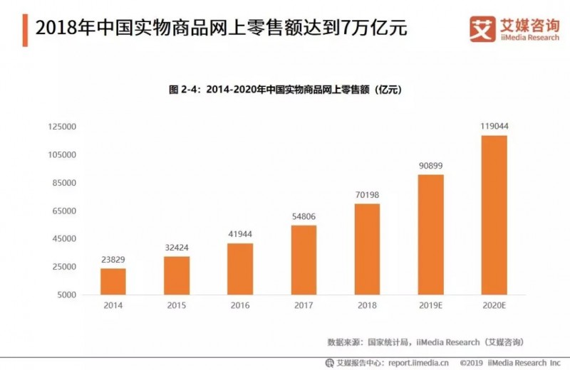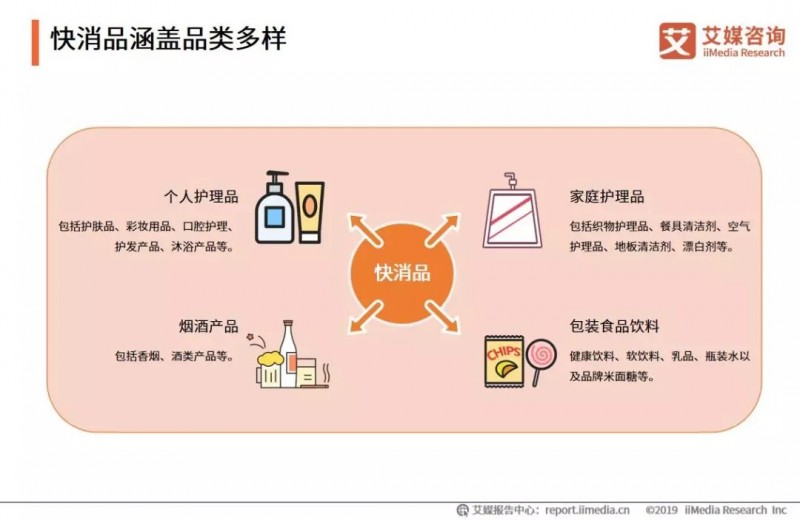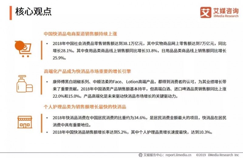 艾媒咨询分析师认为,随着居民消费水平的不断提高,消费者网购习惯的不断深化,快消品企业在电商平台的运营日益规范,2019年电商渠道在快消品各渠道的销售额占比将保持快速增长。2018年中国社会消费品零售销售额达到38.1万亿元,其中实物商品网上零售额达到7万亿元,同比增长28.1%。食用品类商品线上销售额同比增长33.8%,日用品品类商品线上销售额同比增长25.9%,且连续三年保持25%的高速增长,预计未来线上快消品市场规模将继续扩大。