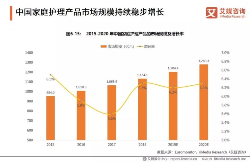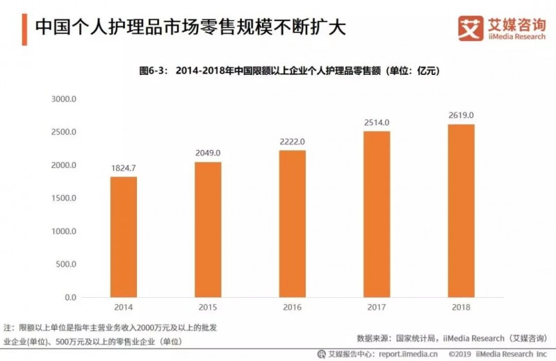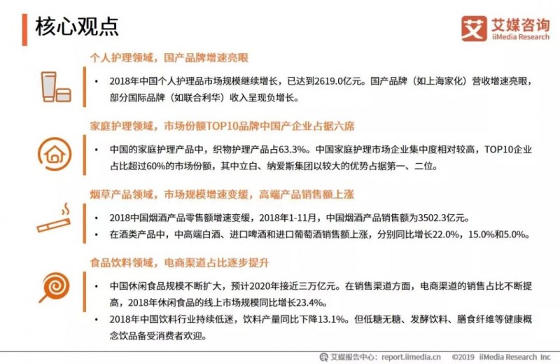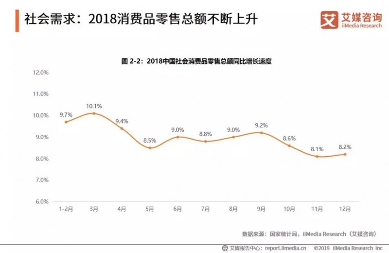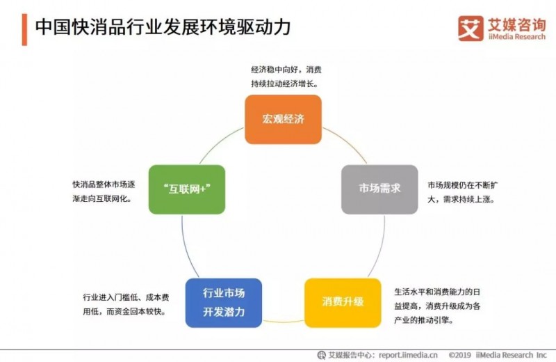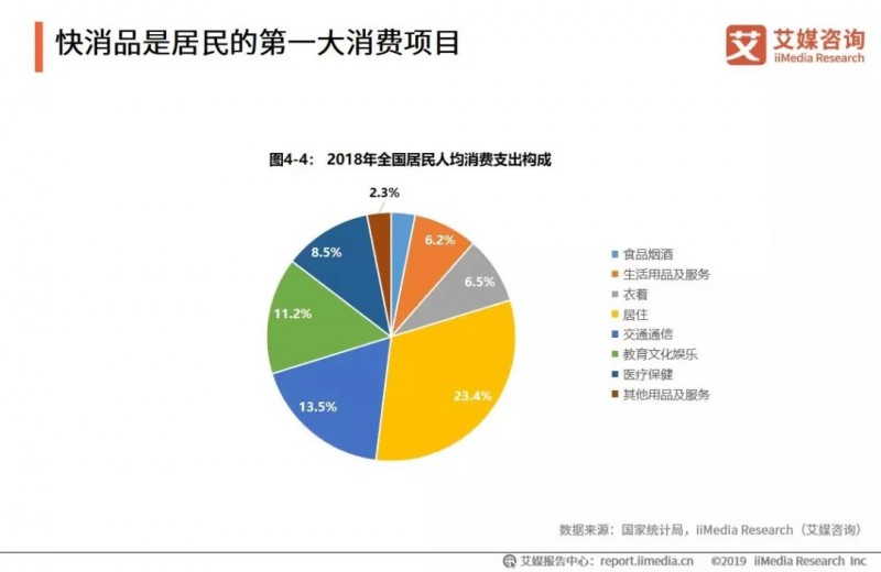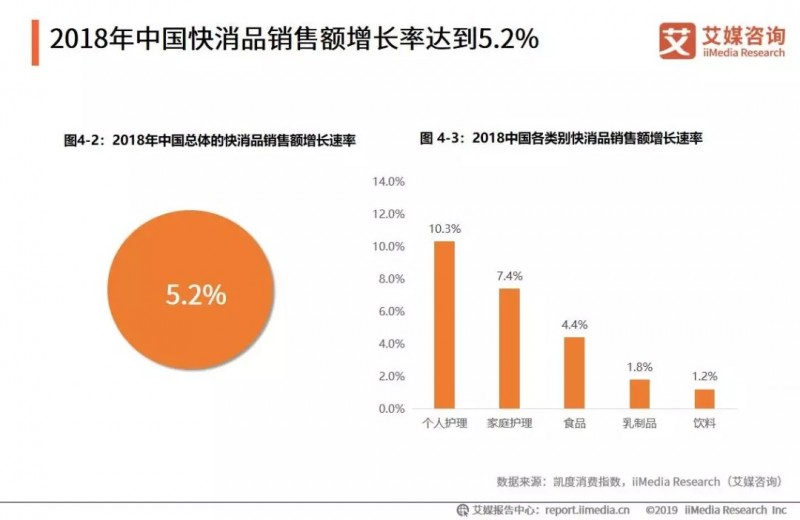 艾媒咨询分析师认为,随着居民消费水平的提高,中国消费者对高端快消品购买意愿的增加,未来中国快消品行业规模将继续稳步上升。2018年快消品消费在中国居民消费的比重约为34.6%,是居民消费金额中占比最大的项目,快消品在居民消费中具有重要地位。2018年中国社会消费品零售销售额达到38.1万亿元,快消品销售额增长率达到5.2%,其中个人护理品类增长速度最快,达到10.3%。