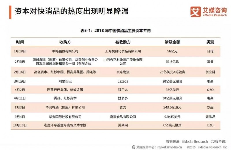 根据最新发布数据,2018年中国共发生238起快消品主要资本事件,与2017年相比增加10.2%;但涉及金额为2476.1亿元,同比减少52.1%,显示出资本对快消品的热度出现降温。快消品并购呈现加码全渠道布局和联合跨界等并购特点。