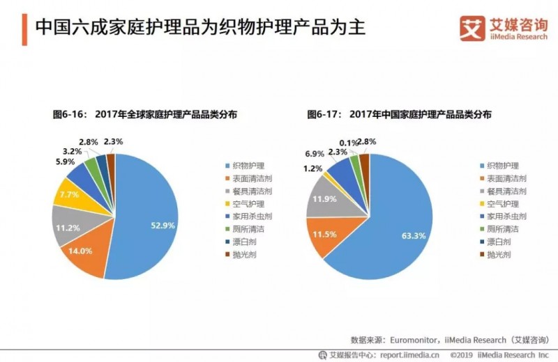 中国的家庭护理产品中,织物护理产品占63.3%,并且比全球织物护理产品比例高出10.4%。而表面护理、空气护理和漂白剂等产品比例则低于全球比例。