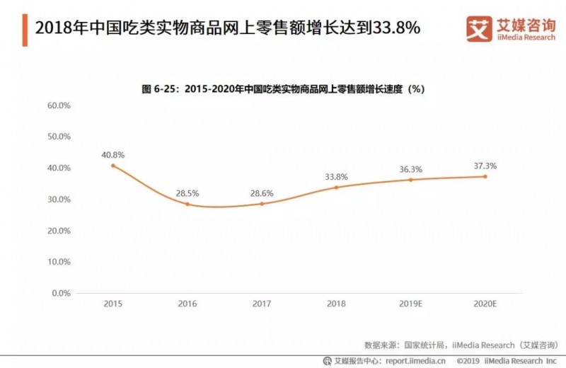 2018年中国吃类实物商品网上零售额增长达到33.8%