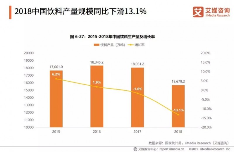 2017年中国饮料产量开始出现下滑,从2016年最高产量18345.2万吨下滑至18051.2万吨,同比下降1.6%。2018年中国饮料行业产量为15679.2万吨,下滑幅度增大,同比下降13.1%,市场持续低迷。