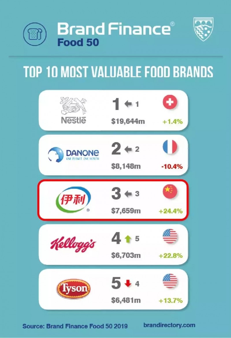 刚刚过去的7月10日,全球品牌价值评估权威机构BrandFinance发布了“2019年度全球最有价值食品品牌50强”排行榜,中国乳制品行业领导者伊利连续两年稳居全球三强。同时,在“Brand Finance 2019 全球乳品品牌榜”中,伊利再次斩获乳品品牌价值全球第二,并获得全球最有潜力乳品品牌,得到国际认可,实现蝉联亚洲第一的乳业荣耀!