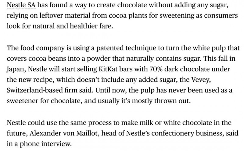 雀巢表示,计划于今年秋季在日本率先推出使用这种配方生产的70%黑巧克力KitKat(奇巧巧克力)产品。现有的、70%黑巧克力KitKat中,每份含有12.3克的糖;而使用可可果肉配方产品的含糖量仅相当于现有产品的60%。