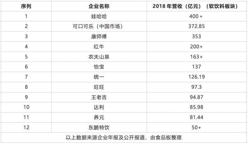 从市场规模来看,娃哈哈、可口可乐、康师傅为前三大软饮料制造商,2018年营收分别为400亿+、372.85亿元、353亿元。其次,农夫山泉、红牛、怡宝、统一企业的饮品板块营收也均超百亿。