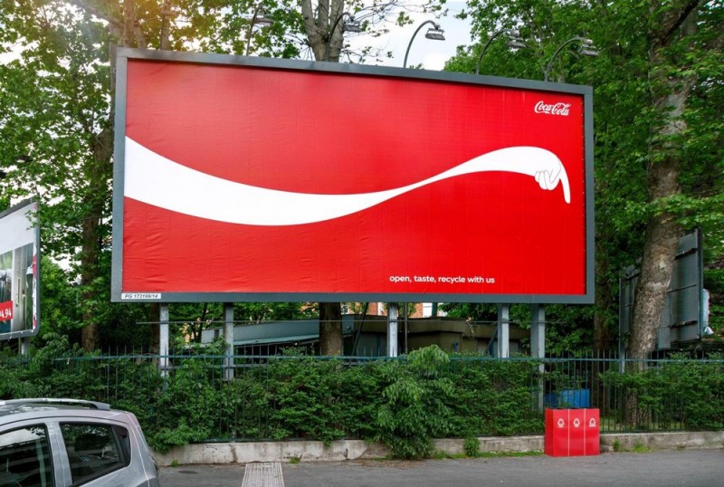 今年六月,可口可乐在国外投放了主题为“A World Without Waste(没有浪费的世界)”的户外广告,将可口可乐标志性的白色飘带设计成手势,指向旁边的垃圾桶以此引导人们的环保行为。