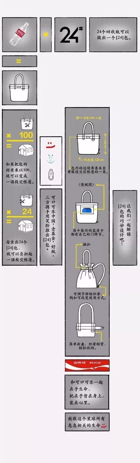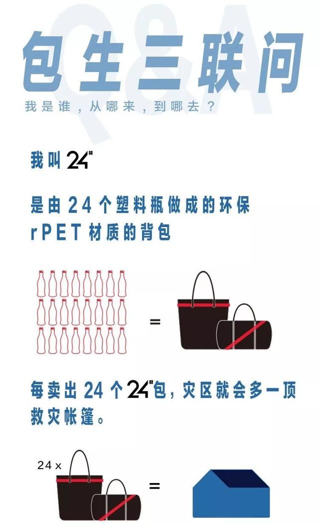 (回收24个塑料瓶就可以做成一个环保背包,每卖出24个环保背包就可以为灾区捐出一顶救灾帐篷。)
