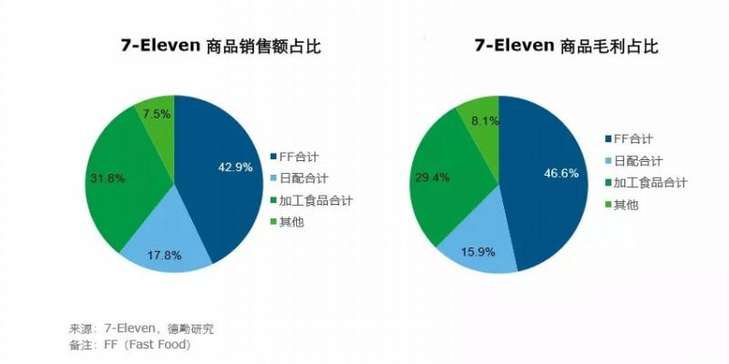 2017年,在新零售之风下,便利店也获得了大量关注。阿里研究院与德勤在一份名为《便利店的下一站》的报告中发现,FF(Fast Food)在7-Eleven的商品销售额中占比最高,为42.9%,毛利贡献也达到了46.6%。