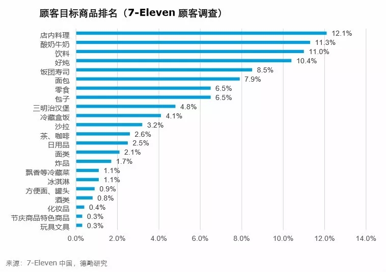 同时,7-Eleven一份对于中国消费者购物行为的调查显示,店内料理是消费者首要的目标商品,占比在12.1%,高于饭团寿司(8.5%)、包子(6.5%)、三明治汉堡(4.8%)、冷餐盒饭(4.1%)等其他鲜食品类。