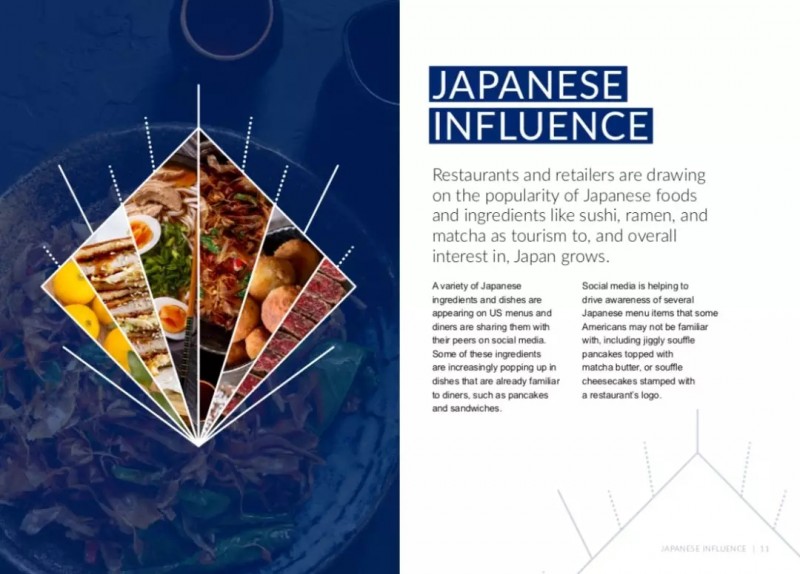 日本食材和菜肴在餐饮行业及包装食品饮料中呈上升趋势,其中柚子元素增长了10%,拉面增长了44%。