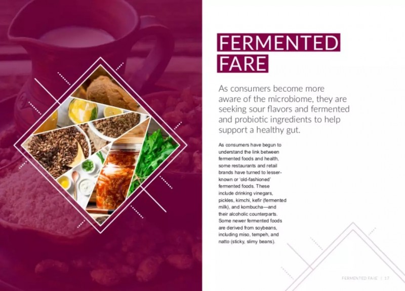 消费者对微生物菌群的健康益处了解得越来越多,他们意识到这种酸味的、通过发酵的、含有益生菌成分的食品可以帮助维持肠道健康。一些餐厅和零售品牌开始推出各式各样的酱菜、泡菜,味噌、豆豉和纳豆等发酵食品,以及即饮醋、开菲尔、康普茶等饮品。发酵特有的酸味甚至被应用到了冷冻甜点中,如泡菜味冰沙等。