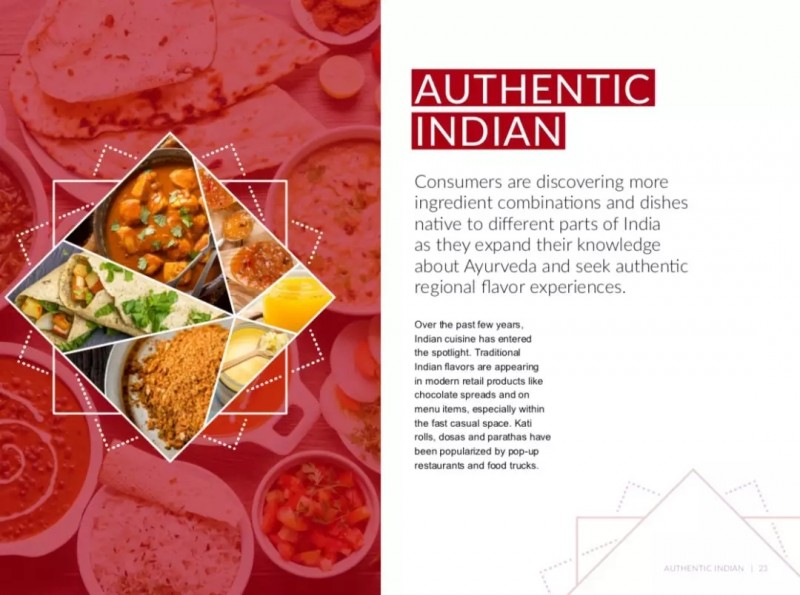 阿育吠陀医学的兴起推动了消费者寻找正宗印度风味体验的兴趣,传统的印度风味越来越多的出现在现代零售产品中,如Kati rolls、dosas和parathas已经因为快闪餐厅和快餐车而流行起来。根据Mintel数据,25%的消费者对于菜谱源于哪个国家哪个地区很感兴趣,29%的国际食品消费者有兴趣购买印度食品,49%的人对印度酱料和调味品感兴趣。