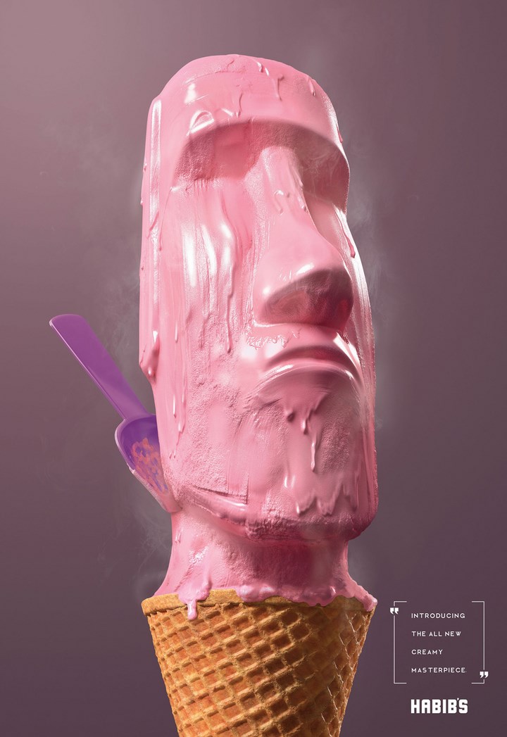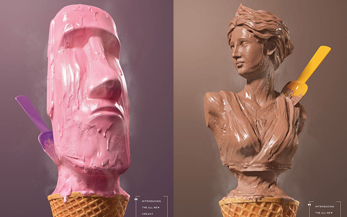 下面这三张海报给了一个很好的回答——把冰淇淋雕成著名雕塑,这手艺可不是谁都可以的。希腊女神阿尔忒弥斯是巧克力味的,复活节岛上的摩艾人像则是草莓味的,香草味就正好给思考者吧。