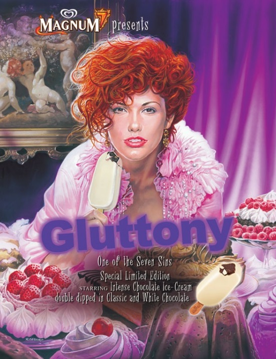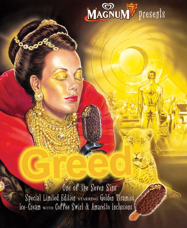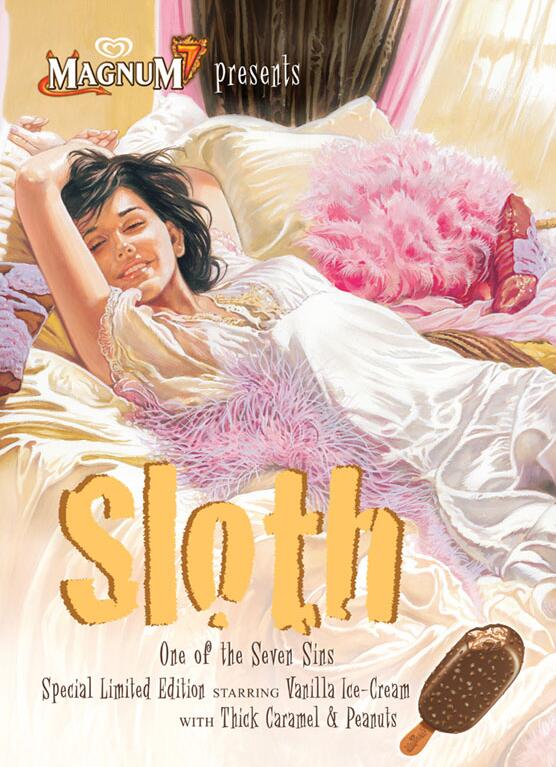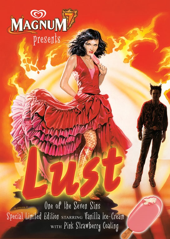 这组海报做出了19世纪的百老汇风格——浓郁绚丽的色彩和突出的主体人物。通过这样的画风,雪糕的质地与画面的整体质感被呈现了出来,视觉上营造了一种性感气氛。需要注意的还有,海报里姑娘们的状态,明明是“原罪”的主题,但她们却个个享受惬意。
