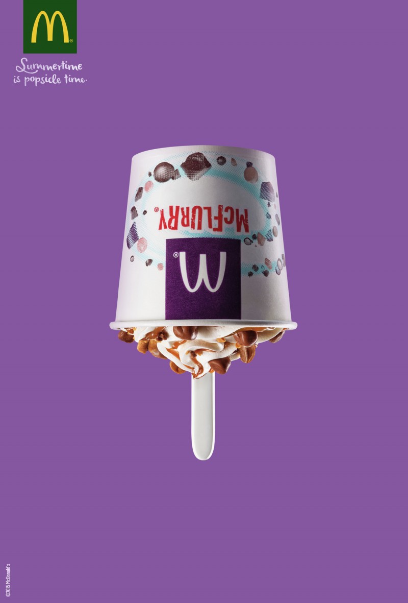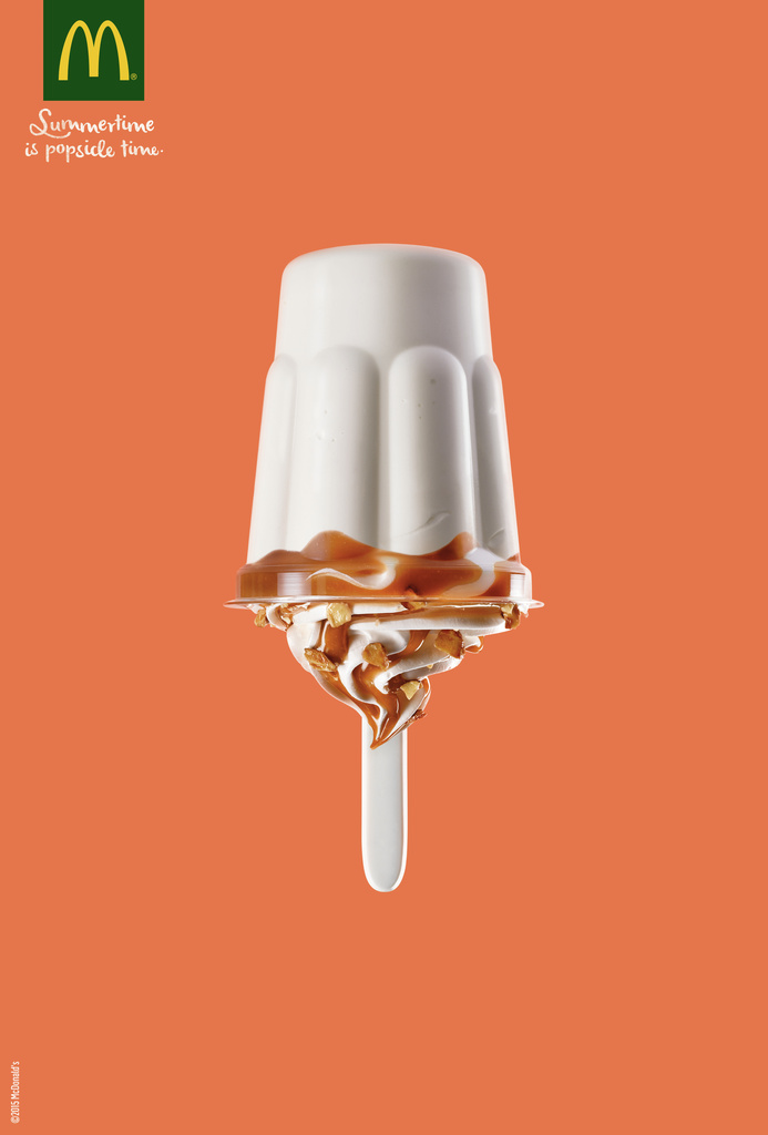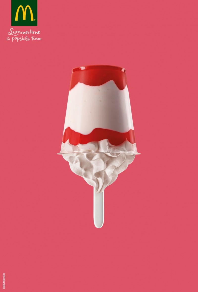 麦当劳这组海报由TBWA作为创意代理。把麦当劳的冰淇淋产品倒置,四舍五入就变成了冰棍。用同一个事物的不同角度来做文章,是一种比较经典的广告技巧。"summer time is popside time"——夏天就是吃冰棍的时间,是这组海报的创意点。