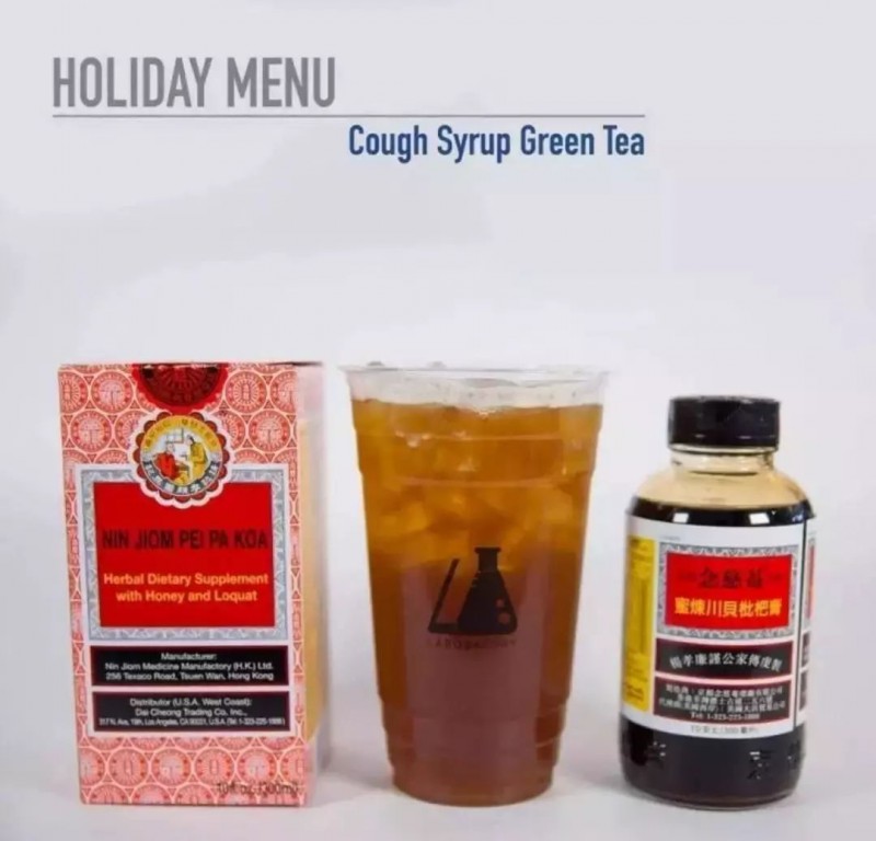 先是在美国,加州洛杉矶一家叫Labobatory的奶茶店,推出一款圣诞新品,自带上瘾特质的川贝枇杷膏绿茶。