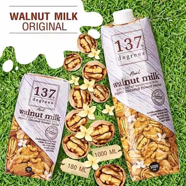 泰国坚果乳第一大公司Simple Foods旗下的137 Degree品牌,生产各种风味的扁桃仁乳、核桃乳和开心果乳。新推出的核桃乳产品,颜值颇高,由加州非转基因核桃制成,产品中加入低GI值的有机椰子花蜜代替蔗糖,不含添加糖、卡拉胶和防腐剂,低糖低热量。137度灭菌工艺和别具一格的包装设计是该品牌产品的共同特点。以这款椰子花蜜核桃乳为例,包装正面上下两部分分别为树皮纹理和核桃图案,准确地传递出天然纯净的产品特质。