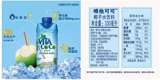 唯他可可椰子水饮料在整个生产过程中做到了简单而严苛的标准,从采摘提取、杀菌到罐装不超过72小时。能量较低,特别的,不含脂肪和胆固醇,含糖量是同体积可乐的三分之一。唯他可可天然椰子水提取自百分之百纯天然青椰子,果汁含量大于99%,配料简单,包含0.5%的果糖和维生素C,低卡路里。作为健康饮品,唯他可可椰子水受到了广大消费者的一致好评。