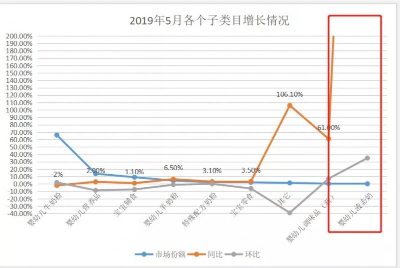 “母婴行业观察创始人杨德勇在《2019年趋势报告》中曾表示:“细分为王,母婴子行业规模在不断扩大,很多细分品类增长率是非常高的。”以奶粉行业为例,随着奶粉新政的逐步实施,企业开始了不断蚕食剩余份额和相互竞争的过程,寻求细分化发展、占据细分化市场份额成为了各家企业不断发展的方向。其中,据母婴研究院数据显示,虽然目前婴幼儿液态奶的市场份额还较低,但增速迅猛,以2019年5月为例,婴幼儿液态奶销售额比2018年同比增长1165.0%,比四月环比增长35.0%。