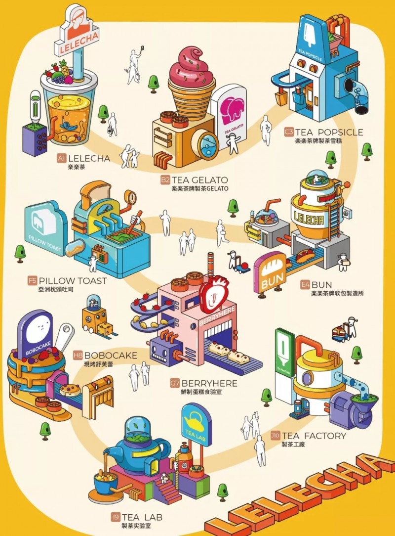 制茶乐园面积近1000㎡,“乐园”的概念也是LELECHA楽楽茶首次原创推出,有一种“嘉年华”的意思。该店不仅面积大,品类也非常丰富,在这里先奉上“游玩指南”(地图)一张。