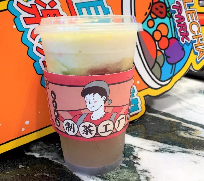 制茶乐园的第一个档口——LELECHA楽楽茶,那些大家耳熟能详的人气茶饮:草莓桃子酪酪、黑糖波霸脏脏茶、杨枝甘露冰冰茶等,就在此处售卖。